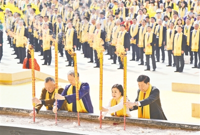 當日上午,黃帝故里園區旗幡獵獵、莊嚴肅穆。南門廣場上,龍騰虎躍,鼓聲震天。寓意著中華兒女來自五湖四海的540名炎黃子孫,分別組成各90人的文化方陣、岐黃方陣、企業方陣、同拜方陣、臺胞方陣、僑胞方陣六大拜祖隊伍,整肅衣冠,佩戴黃帝絲巾,進尋根門、經系祖壇、上軒轅橋、過故里祠,觀甲骨碑林方柱高舉,感杜嶺方鼎王者風范,聽青銅編鐘古音繚繞,最后緩步來到拜祖廣場,端詳兩側連廊浮雕,感觸中華文明五千多年的源遠流長。